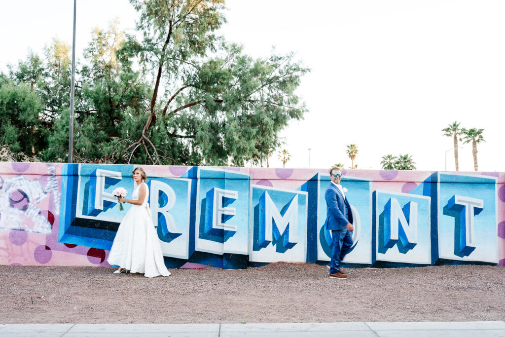 Honestly? Some of the most beautiful elopement photography in Las Vegas happens nowhere near the Strip. Red Rock Canyon is our top recommendation for couples who want dramatic, natural backdrops — the landscape is unlike anywhere else in the country. There’s surrounding areas of Red Rock Canyon that you can take portraits and don’t need a permit because it’s under BLM. If you’re looking for the flat desert vibes, we recommend Jean Dry Lake Bed which is also right next to Seven Magic Mountain. For something more intimate and off the beaten path, Nelson Ghost Town offers incredible rustic character. And if you want the city energy without the tourist crowds, the Arts District and Fremont Street (especially at golden hour or after dark) deliver something truly unique.